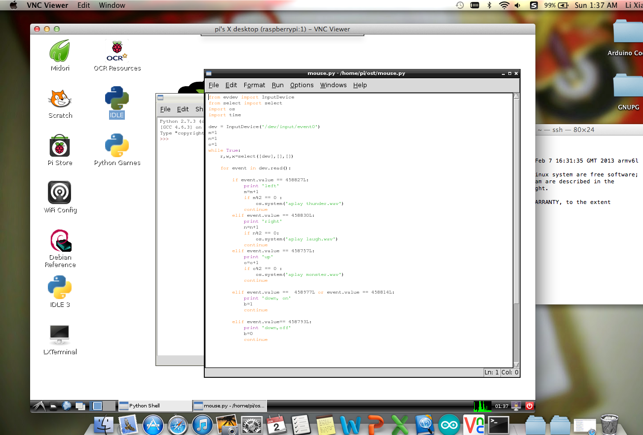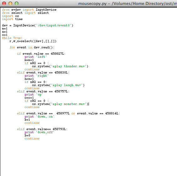 It receives the signal from a normal RF presenter with a USB receiver , then Raspberry Pi runs a python program that can read the presenter’s event value. With the help of mini speaker system, you can play any kind of sounds as long as it can be stored into the Raspberry Pi, such as screaming, laughter and some scary monster’s voice etc. Then an Arduino board is used to control a loop to blink the LEDs after connecting Raspberry Pi and Arduino using a jumper wire together.